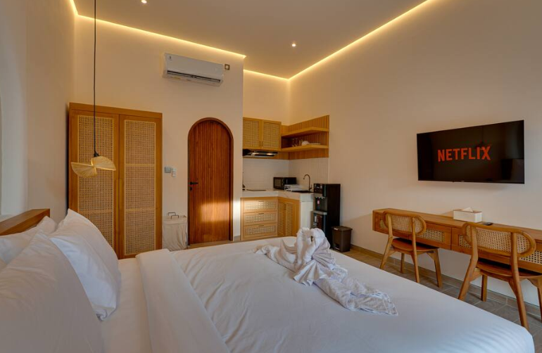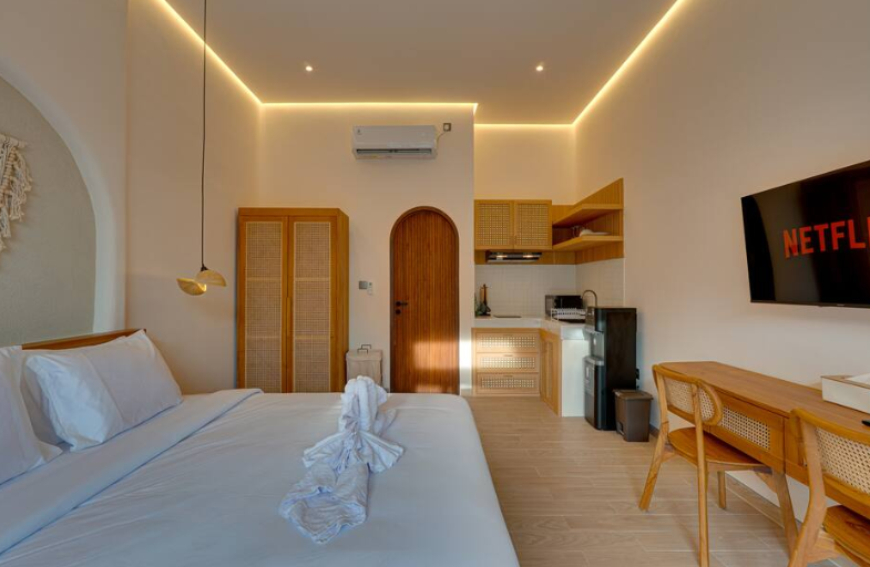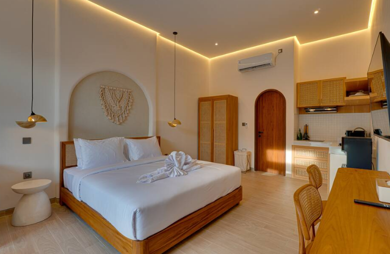 Loona Suite Apartment offers a calm and stylish stay in the peaceful area of Umalas, perfectly positioned between Seminyak and Canggu. This thoughtfully designed one-bedroom suite blends warm wooden elements with soft ambient lighting, creating a relaxed and inviting atmosphere ideal for couples or solo travelers.