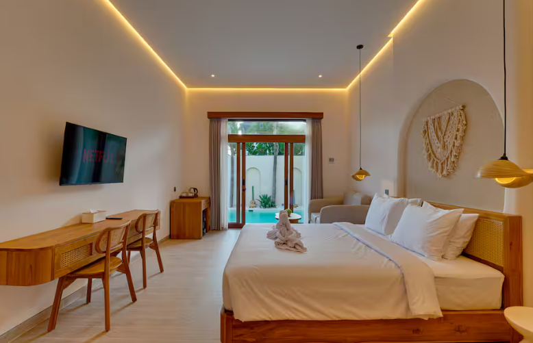 Loona Suite Apartment offers a calm and stylish stay in the peaceful area of Umalas, perfectly positioned between Seminyak and Canggu. This thoughtfully designed one-bedroom suite blends warm wooden elements with soft ambient lighting, creating a relaxed and inviting atmosphere ideal for couples or solo travelers.